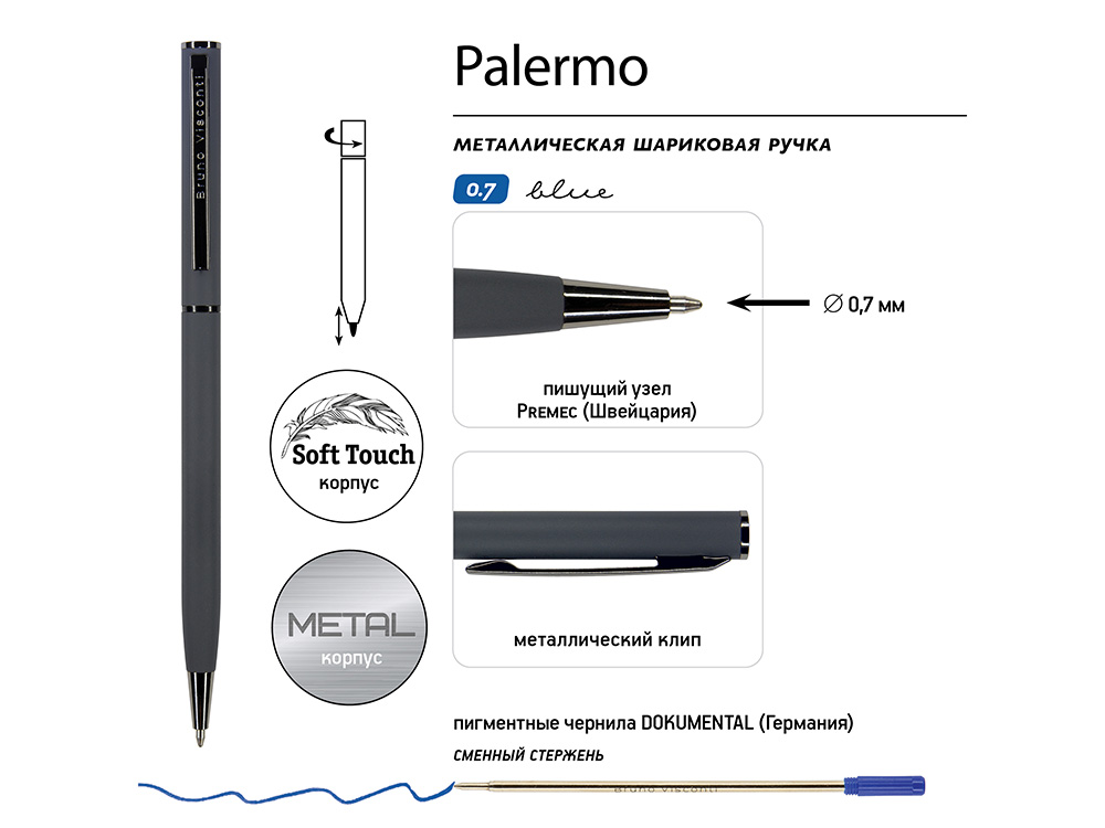 Автоматическая металлическая ручка "Bruno Visconti" серии "Palermo" однотонного цвета порадует любителей всего изящного и утонченного. Покрытие корпуса Soft Touch гарантирует дополнительный комфорт в работе с ней. Стержень легко выдвигается благодаря поворотному механизму. Синие пигментные чернила Dokumental (Германия) и пишущий узел Premec (Швейцария) обеспечивают качественное и мягкое письмо.