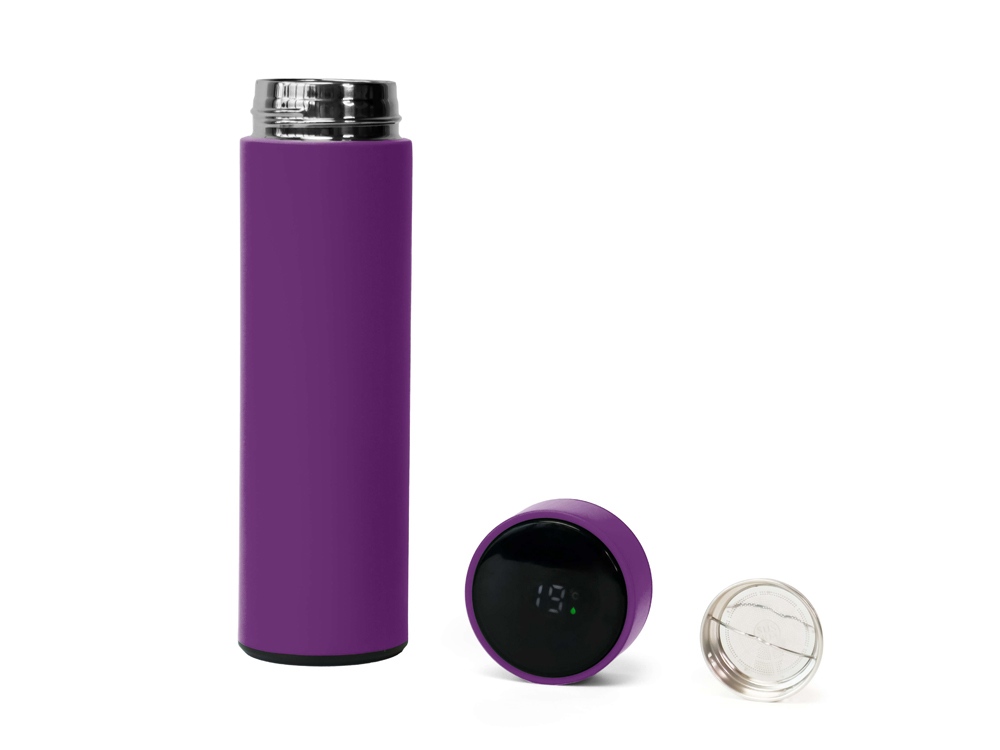 Термос выполнен из нержавеющей стали и покрыт цветным soft-touch покрытием. Его особенность — инновационная крышка со встроенным термометром и LED-дисплеем, который отображает температуру напитка внутри.