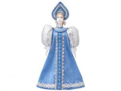 - Фарфоровая кукла в народном костюме: ручная работа, украшенная детализированным голубым сарафаном, воздушными белыми рукавами и нарядным кокошником с узорами. Кукла воплощает эстетику старинных русских праздников.