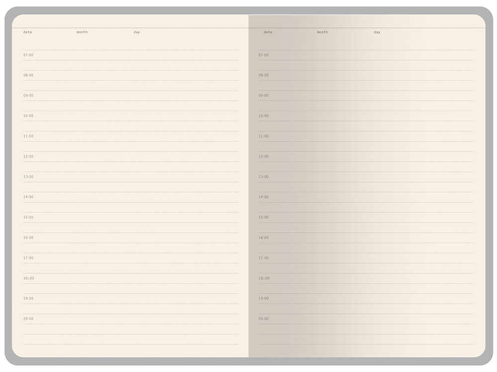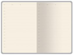 Бумажный блок, закрепленный книжным переплетом, выполнен из бежевой офсетной бумаги плотностью 70 г/ кв м. Внутри блока есть страница для персональных данных, справочная информация на 13 страницах. Блок для записей имеет линовку с указанием временных интервалов в один час.