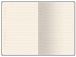 Бумажный блок, закрепленный книжным переплетом, выполнен из бежевой офсетной бумаги плотностью 70 г/ кв м. Внутри блока есть страница для персональных данных, справочная информация на 13 страницах. Блок для записей имеет линовку с указанием временных интервалов в один час.