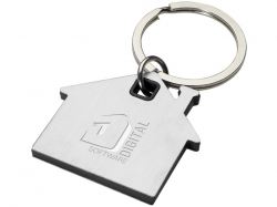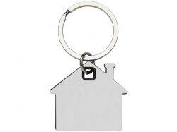Брелок для ключей в форме домика с цветной вставкой из пластика между 2-мя серебристыми пластинами из стали.