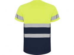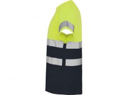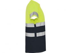 Футболка со светоотражающими элементами с короткими рукавами. Круглая горловина из той же ткани, с усиленными закрытыми швами на внутренней стороне горловины. Две горизонтальные светоотражающие полосы на туловище и одна светоотражающая полоса на рукавах.