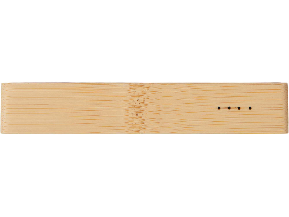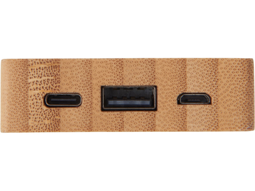 Компактный и стильный внешний аккумулятор ёмкостью 5 000 мАч — идеальный спутник для повседневных дел и коротких поездок. Его корпус сочетает в себе натуральный бамбук и переработанный ABS-пластик, что делает устройство не только более экологичным, но и визуально премиальным. Особый шарм ему придаёт встроенная панель с белой подсветкой с возможностью нанесения логотипа — ваш бренд или инициалы мягко засветятся в темноте, привлекая внимание и подчеркивая индивидуальность. Это не просто power bank — это экосознательный аксессуар, который заряжает ваши гаджеты и вдохновляет окружающих.