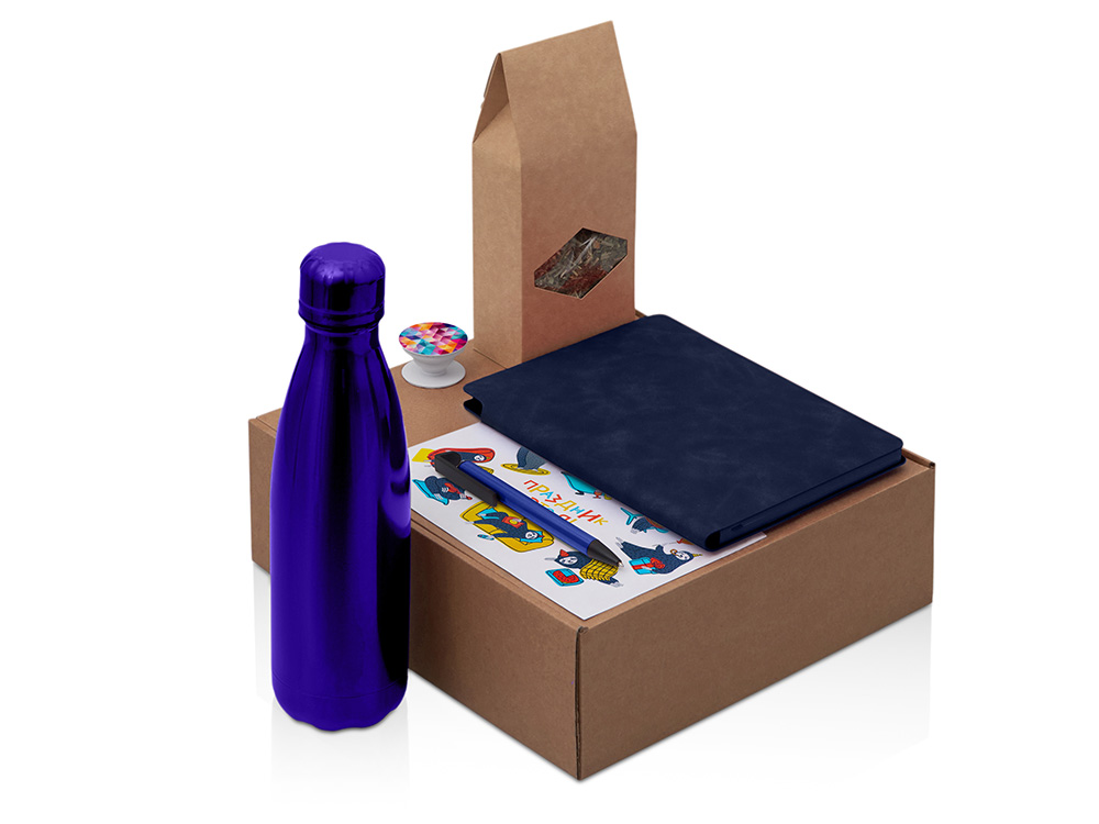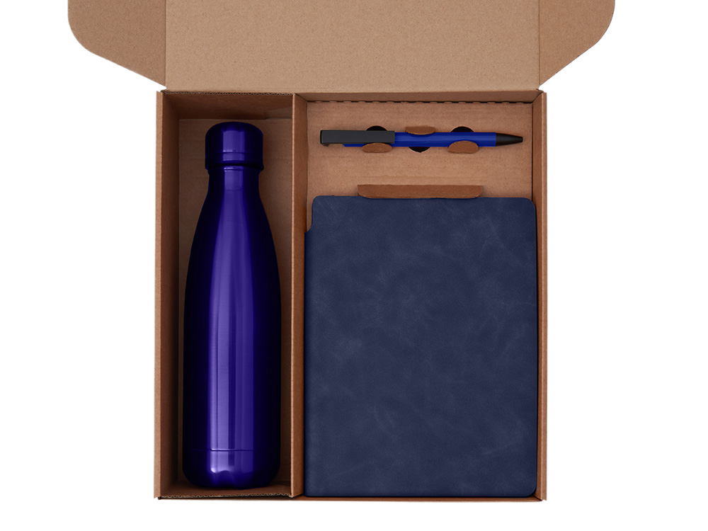 Подарочный набор с термобутылкой, блокнотом, ручкой и чаем, синий