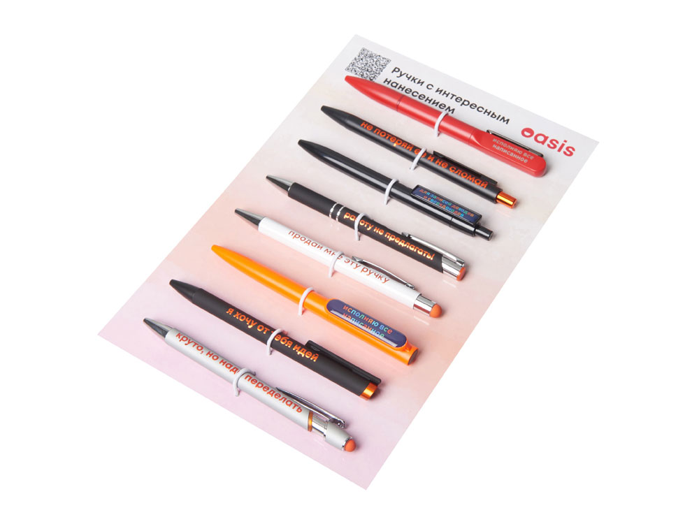 Промо-сет ручек с интересными нанесениями — это презентационный комплект, включающий 8 уникальных моделей с несколькими вариантами нанесения: гравировка и заливка полимерной смолой.