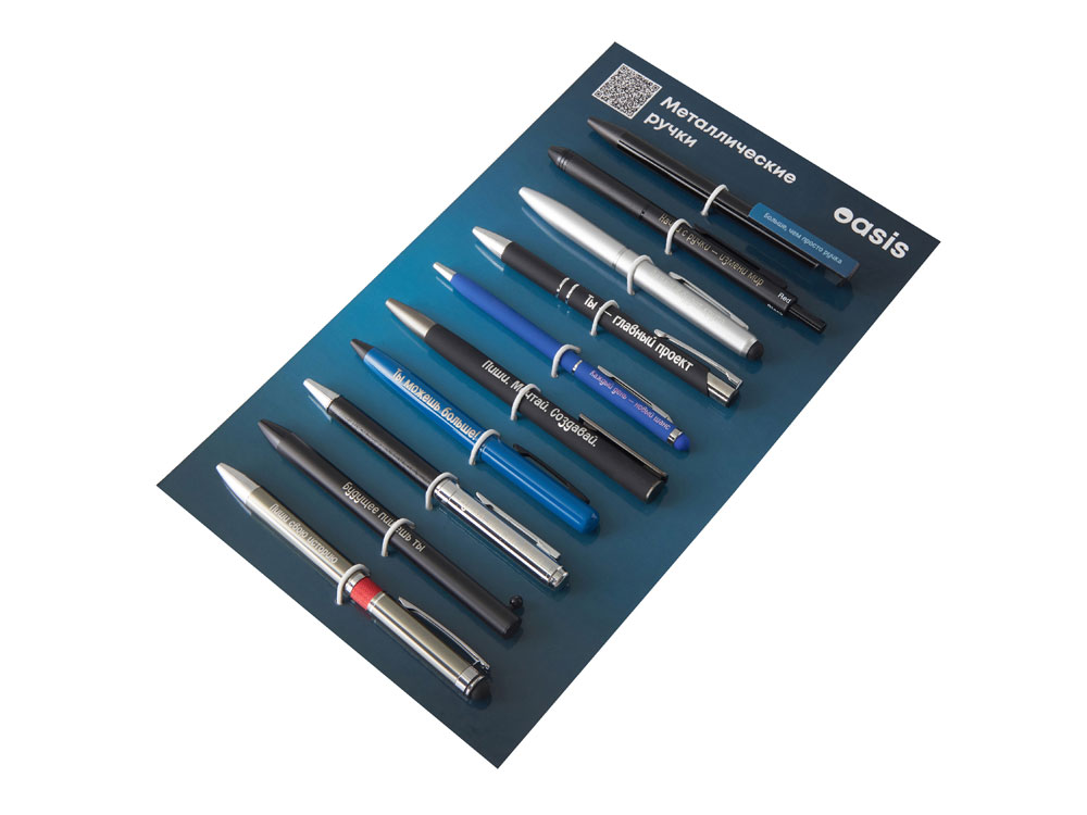 Промо-сет металлических ручек — это презентационный комплект, включающий 10 уникальных моделей с несколькими вариантами нанесения: УФ-печать, гравировка.