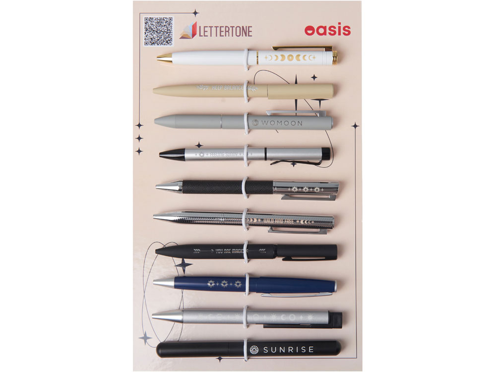 Сет металлических ручек Lettertone — это готовый презентационный комплект, включающий 10 стильных моделей ручек с примерами нанесения: гравировка и тампопечать.