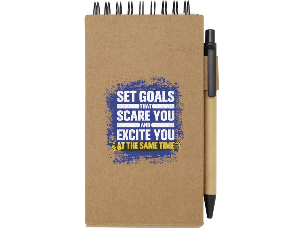 Липкий блокнот с шариковой ручкой. В блокноте 30 листов белой линованной бумаги плотностью 70 г/м2 (8 x 12 см). В комплект также входят 25 разноцветных (5 x 1,2 см) и 25 желтых (7,5 x 7,5 см) клейких листочков, оба типа на бумаге плотностью 70 г/м2. Корпус шариковой ручки изготовлен из переработанной бумаги. Цвет чернил: черный. Длина непрерывной линии: 1000 метров. Размер пера: 1,00 мм.