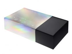 Подарочная коробка из прочного микрогофрокартона, кашированная бумагой с матовой ламинацией, выглядит элегантно и надёжно защищает содержимое. Новогодний голографический шубер с мерцающими серебристыми переливами придаёт ей праздничный блеск и делает каждый подарок по-настоящему особенным.