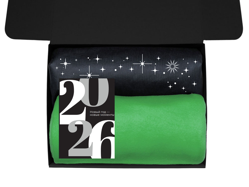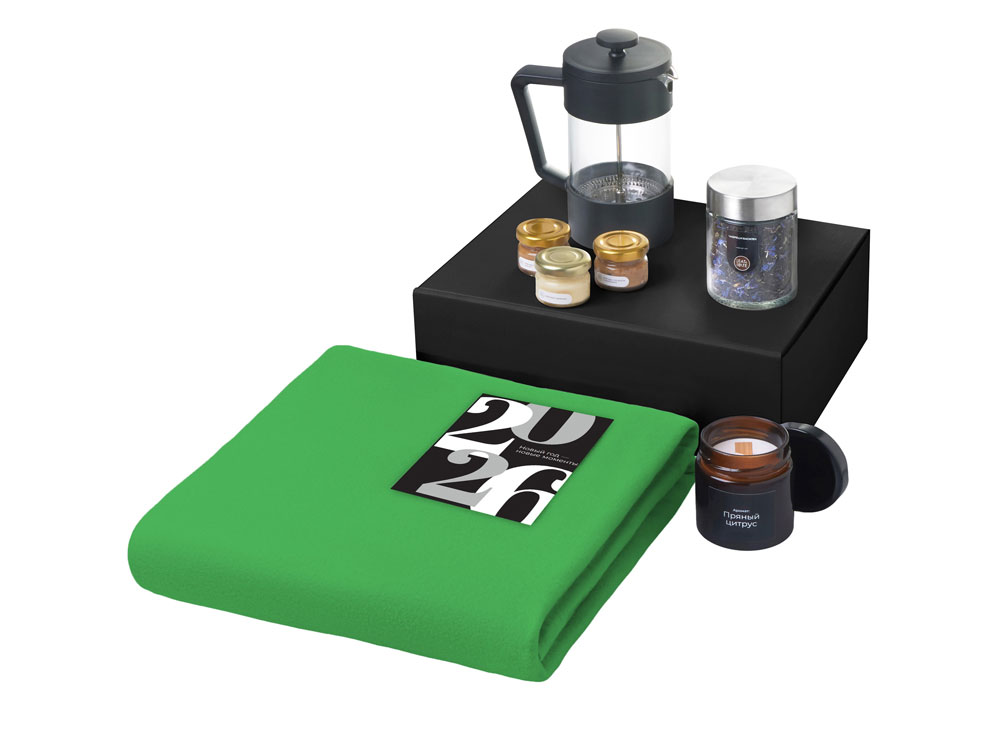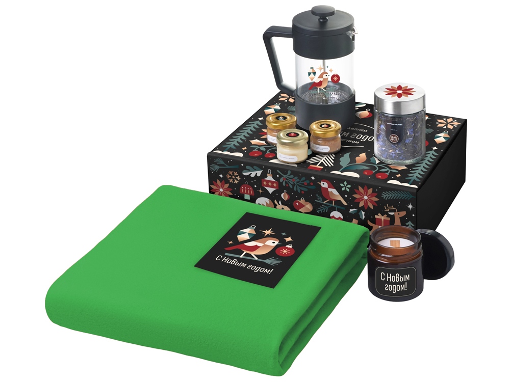 Подарочный набор c пледом, френчпрессом, чаем и медом, зеленый