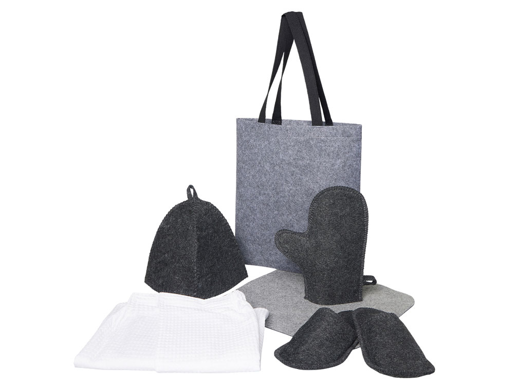 Банный набор "Healing" для настоящего ценителя сауны: коврик, мужской вафельный килт, рукавица, шапка, тапочки — всё в стильном фетровом шоппере.