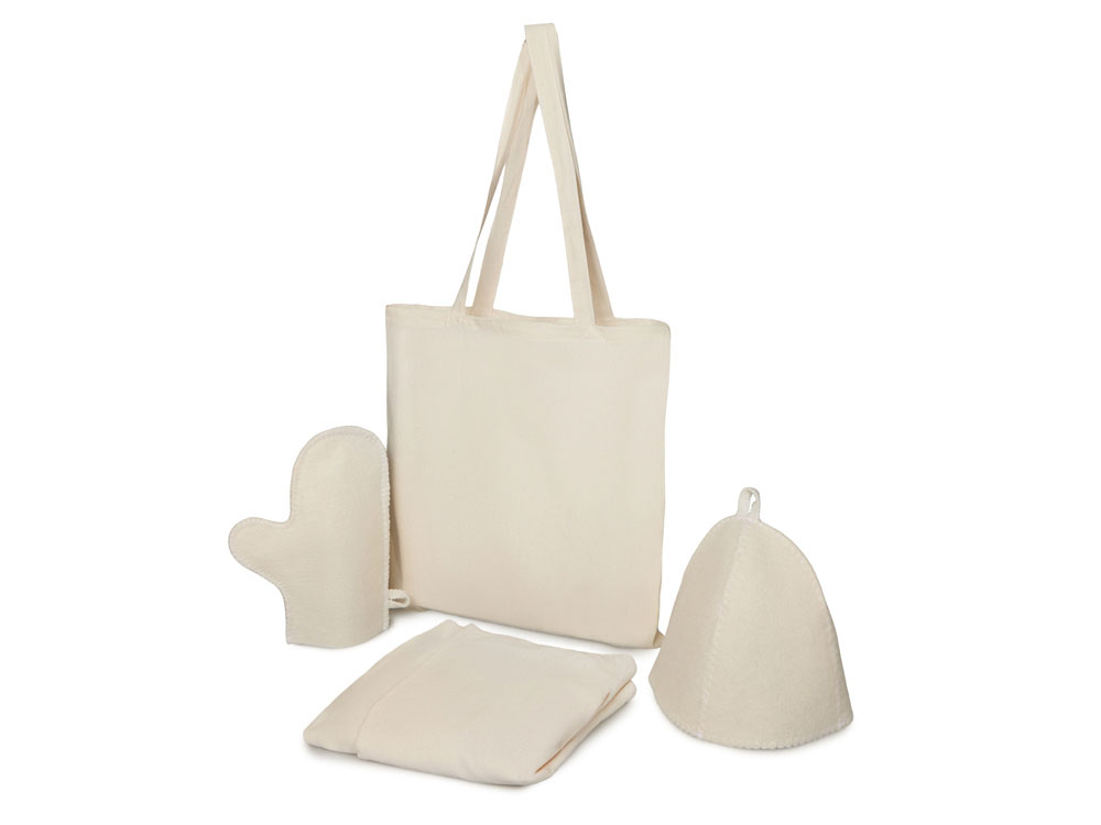 Создайте уют в парной: женский холщовый килт, шапка и рукавица — всё необходимое для отдыха, аккуратно сложено в хлопковый шоппер.