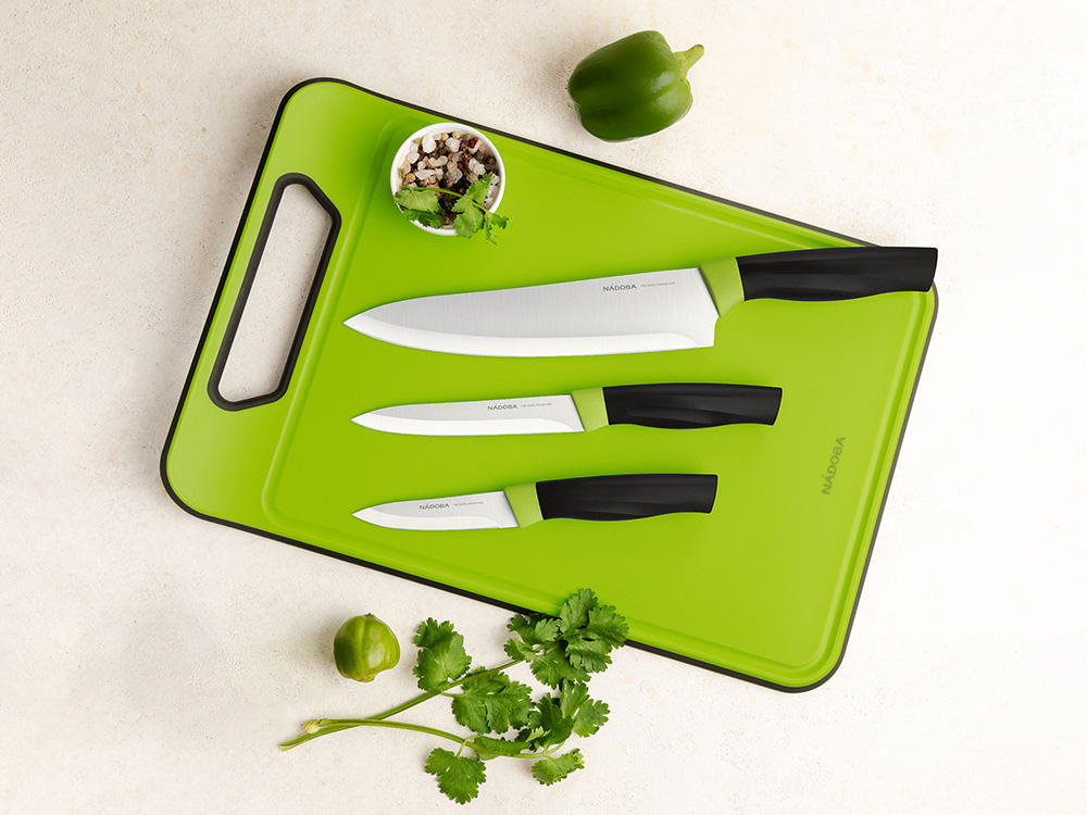 Набор из 3 ножей с доской NADOBA серии Olivia состоит из: нож овощной, 9 см, нож универсальный, 12,5 см, нож поварской, 20 см и разделочной доски 37,5х25х0,8 см.