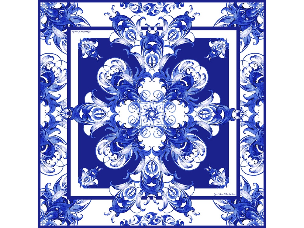 Платок «Гжель» от бренда «Русские в моде» выполнен в технике знаменитой кобальтовой росписи. Узоры в тонких оттенках синего цвета, размещенные на белом фоне, — один из самых распространенных рисунков гжель, чья форма столетиями доводилась мастерами до совершенства. На полотне восхитительные соцветия тугих бутонов и ажурных лепестков гармонично соседствуют с узнаваемыми сине-голубыми завитками, спиралями и линиями.