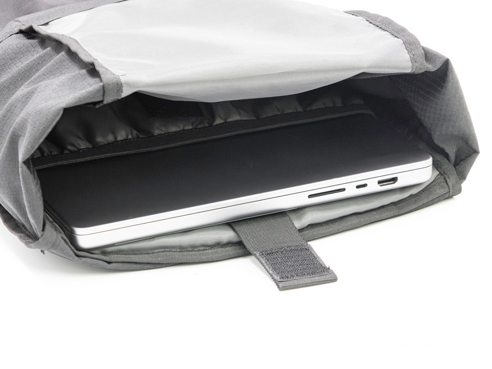 Легкий, элегантный, складывающийся рюкзак вместителен и удобен благодаря системе закрытия основного отделения roll-top, наличию трех наружных карманов спереди и по бокам из прочной эластичной сетки и внутреннему плотному карману для ноутбука до 16". Лямки с эластичными карманами для карт, телефона и других мелочей фиксируются на груди пряжкой, которую можно отрегулировать по высоте под ваш рост. Эластичные фиксирующие шнурки имеют светоотражающее нанесение, что обеспечивает дополнительную защиту в темное время суток. Дышащая сетка на спинке обеспечивает удобство и комфорт. На нагрудной пряжке предусмотрен свисток для экстренного случая. Водостойкая ткань верха изготовлена из переработанного пластика, пропитана специальным составом против загрязнения. В комплекте металлический шильд для нанесения вашего логотипа.