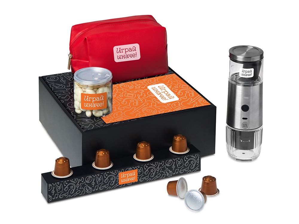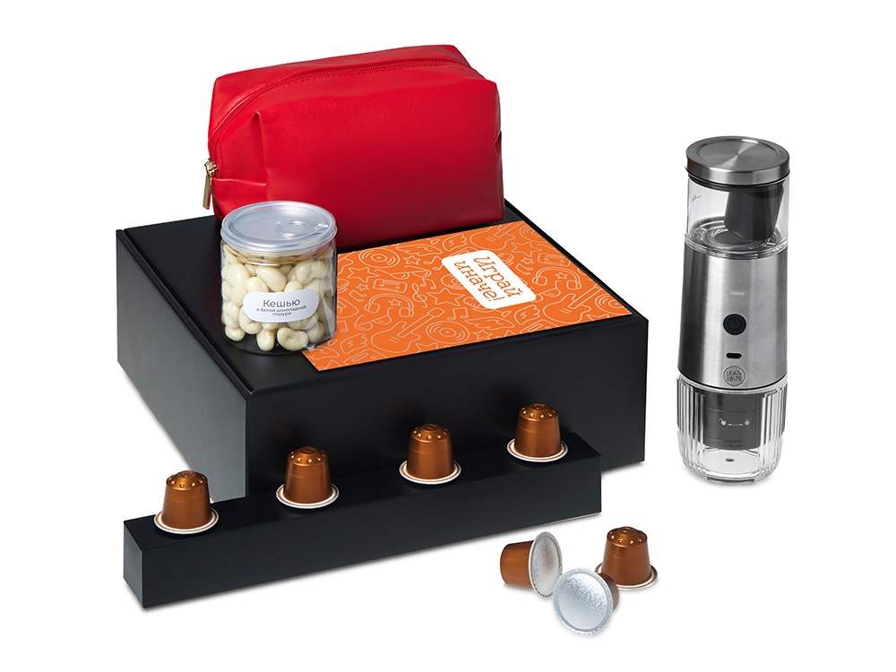 Набор "Re:y. Boost" о бодрости, энергии и маленьких ритуалах, которые можно взять с собой. Портативная кофемашина и кофе в капсулах позволяют приготовить ароматный напиток дома, в офисе или на прогулке. Кешью в глазури добавляет сладкую нотку, а косметичка позволяет взять любимые вещи с собой, куда бы вы ни отправились.. Этот набор превращает привычный утренний ритуал в момент бодрости и комфорта, где бы вы ни были.