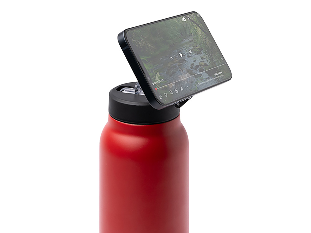 Термобутылка с двойными стенками и магнитным кольцом для крепления мобильного телефона. Корпус из переработанной нержавеющей стали 304. Складная трубочка и нескользящая резиновая накладка на дне. Объём: 750 мл. Упаковка: эко-коробка.