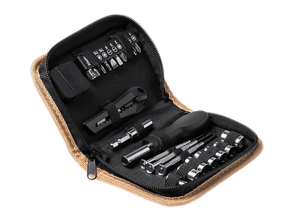 Набор инструментов из 25 аксессуаров. Канцелярский нож, шестигранные ключи, звездчатые и плоские отвертки, отвертка под разные насадки и рулетка 100 см. Набор поставляется в пробковом футляре.