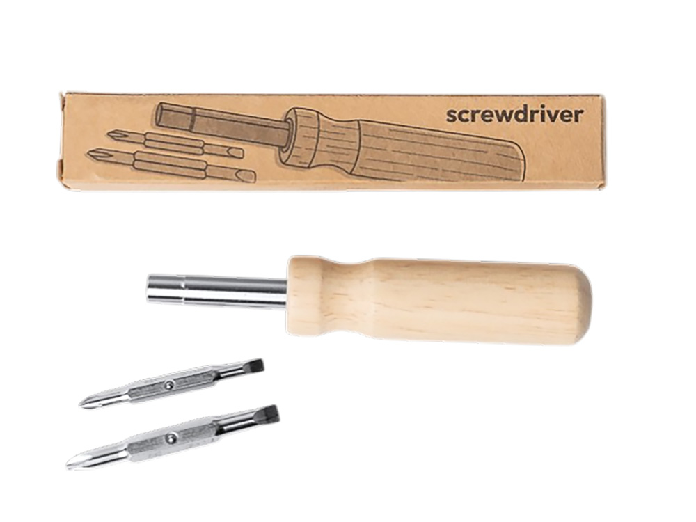 Отвертка из нержавеющей стали с круглой деревянной ручкой. В комплекте две биты с 2 насадками под крестовую и плоскую отвертки.