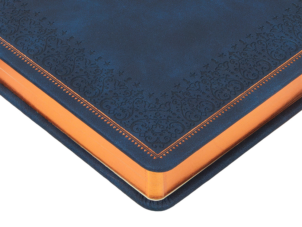 Недатированный ежедневник "Royal" формата А5 с твердой обложкой из искусственной кожи с имитацией нубука украшен художественным бронзовым и блинтовым тиснением. Внутри 256 страниц, выполненных из качественной бежевой бумаги в линейку плотностью 100 г/м². Два шелковых ляссе в цвет обреза блока и обложки облегчают навигацию по записям. Французский корешок дополнительно декорирован изящным бронзовым тиснением в виде виньеток. Скругленные углы обложки и блока подчеркивают стильный дизайн изделия, а блеск бронзового обреза дарит ежедневнику благородный и роскошный внешний вид.