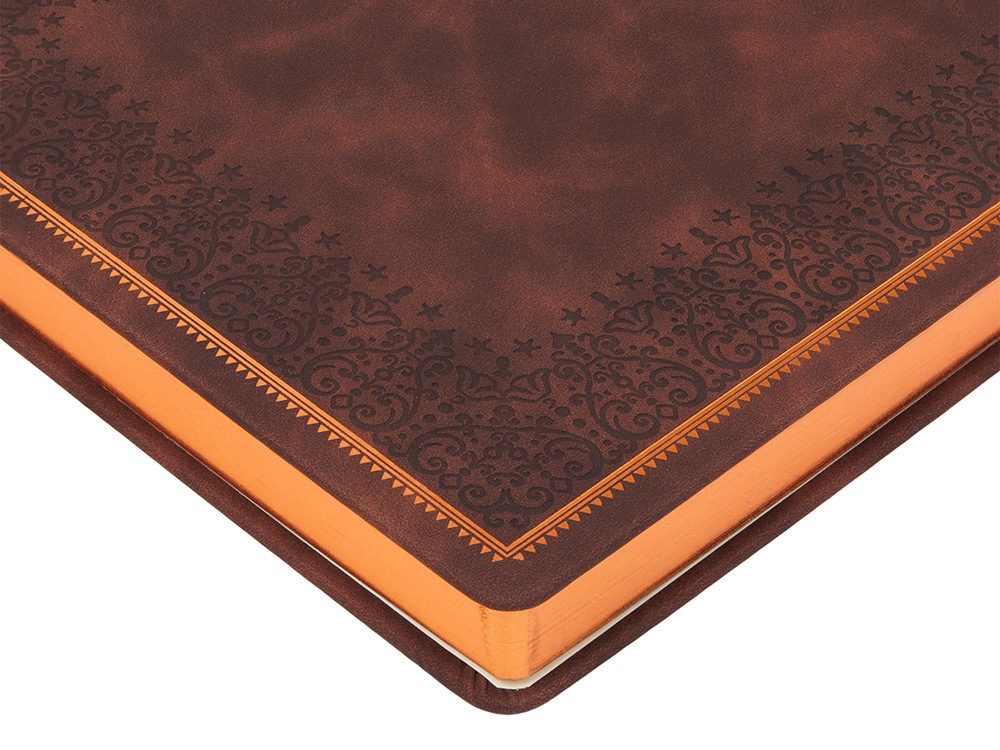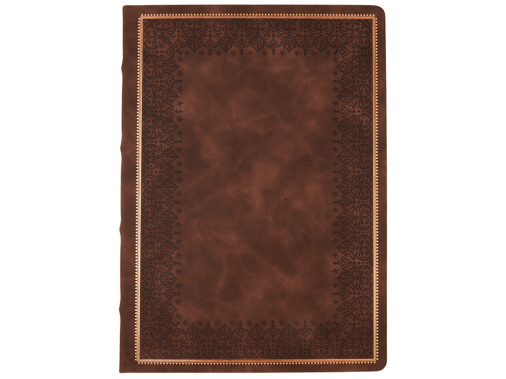 Недатированный ежедневник "Royal" формата А4 с твердой обложкой из искусственной кожи с имитацией нубука украшен художественным бронзовым и блинтовым тиснением. Внутри 192 страницы, выполненные из качественной бежевой бумаги в линейку плотностью 140 г/м². Два шелковых ляссе в цвет обреза блока и обложки облегчают навигацию по записям. Французский корешок дополнительно декорирован изящным бронзовым тиснением в виде виньеток. Скругленные углы обложки и блока подчеркивают стильный дизайн изделия, а блеск бронзового обреза дарит ежедневнику благородный и роскошный внешний вид.