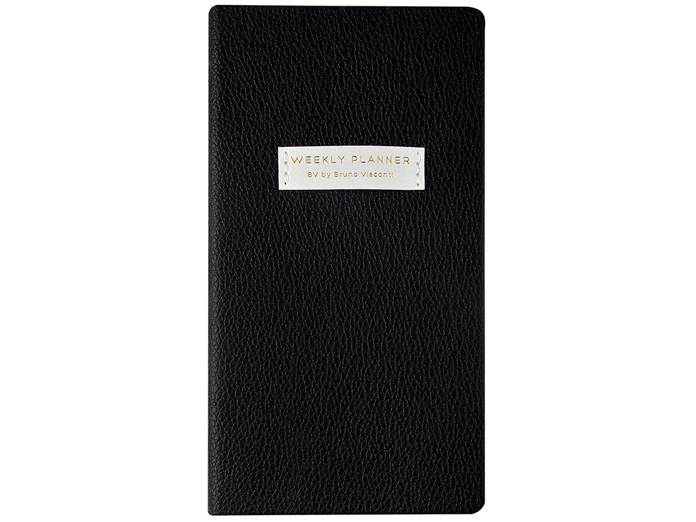 Внутри — недатированный блок формата А6 (84×160 мм) на бежевой бумаге 80 г/м². Книжный переплёт хорошо раскрывается, а скруглённые углы одновременно придают еженедельнику премиальный вид и защищают края при носке. Ляссе‑закладка выполнена в цвет обложки и помогает быстро находить нужную страницу.