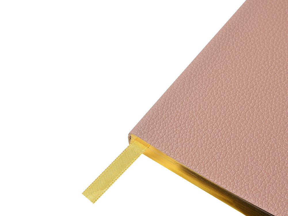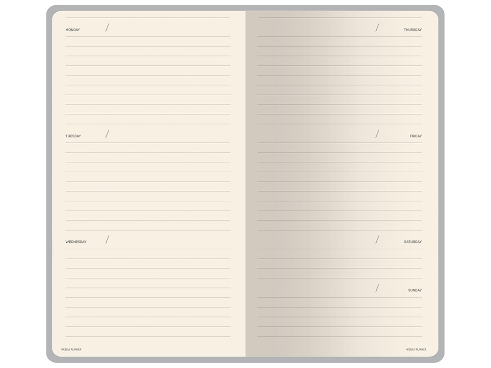 Внутри — недатированный блок формата А6 (84×160 мм) на бежевой бумаге 80 г/м². Книжный переплёт хорошо раскрывается, а скруглённые углы одновременно придают еженедельнику премиальный вид и защищают края при носке. Ляссе‑закладка выполнена в цвет обложки и помогает быстро находить нужную страницу.