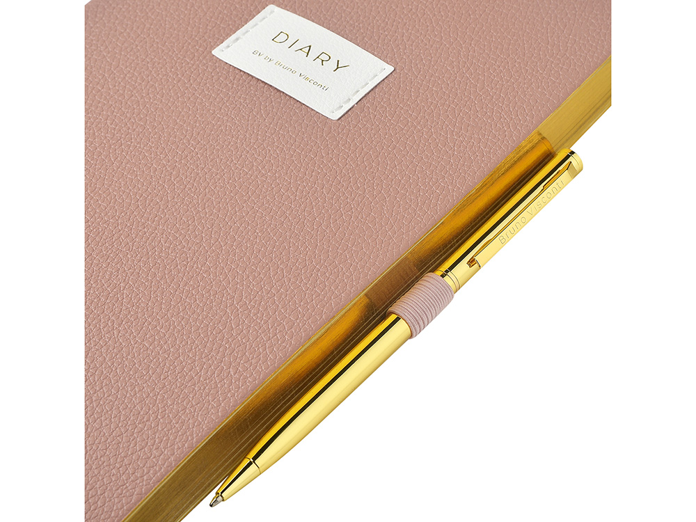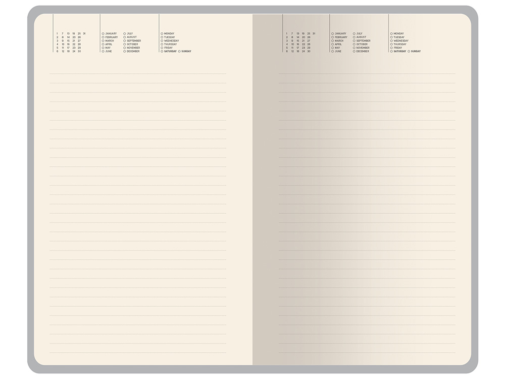 Внутри — недатированный блок формата А5 (125×200 мм) на бежевой бумаге 80 г/м². Книжный переплёт хорошо раскрывается, а скруглённые углы одновременно придают ежедневнику премиальный вид и защищают края при носке. Завершают детали ляссе в цвет обложки и петля для ручки — чтобы всё нужное было под рукой.