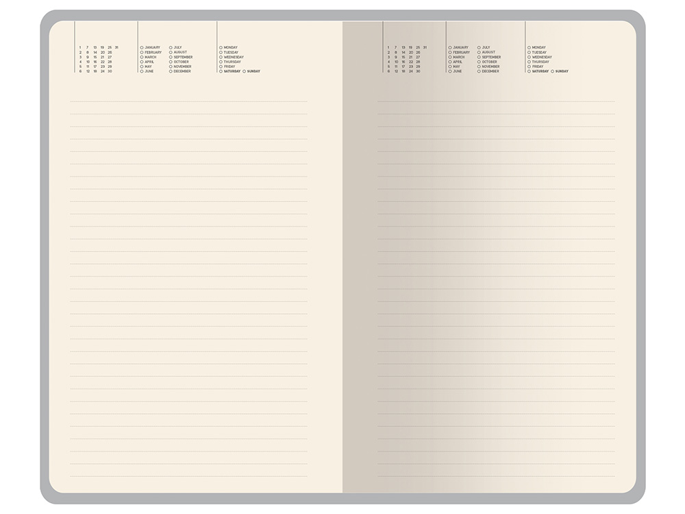 Внутри — недатированный блок формата А5 (125×200 мм) на бежевой бумаге 80 г/м². Книжный переплёт хорошо раскрывается, а скруглённые углы одновременно придают ежедневнику премиальный вид и защищают края при носке. Завершают детали ляссе в цвет обложки и петля для ручки — чтобы всё нужное было под рукой.