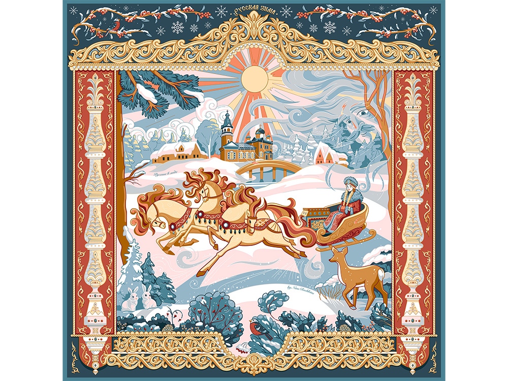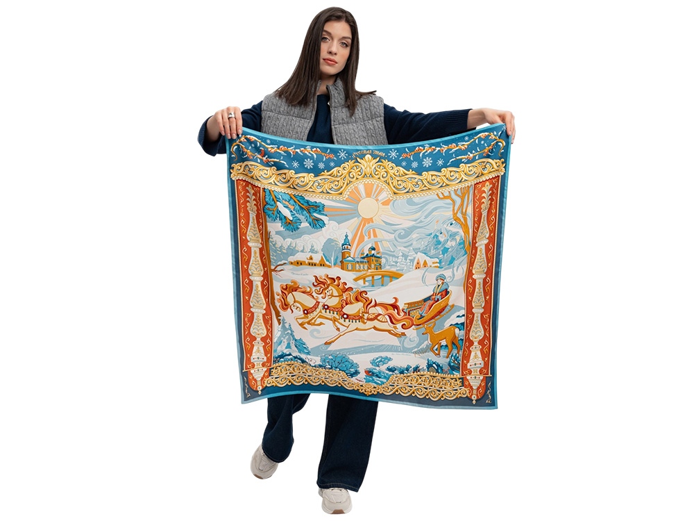 Платок «Русская зима» воплощает фольклорный образ красавицы-зимы.