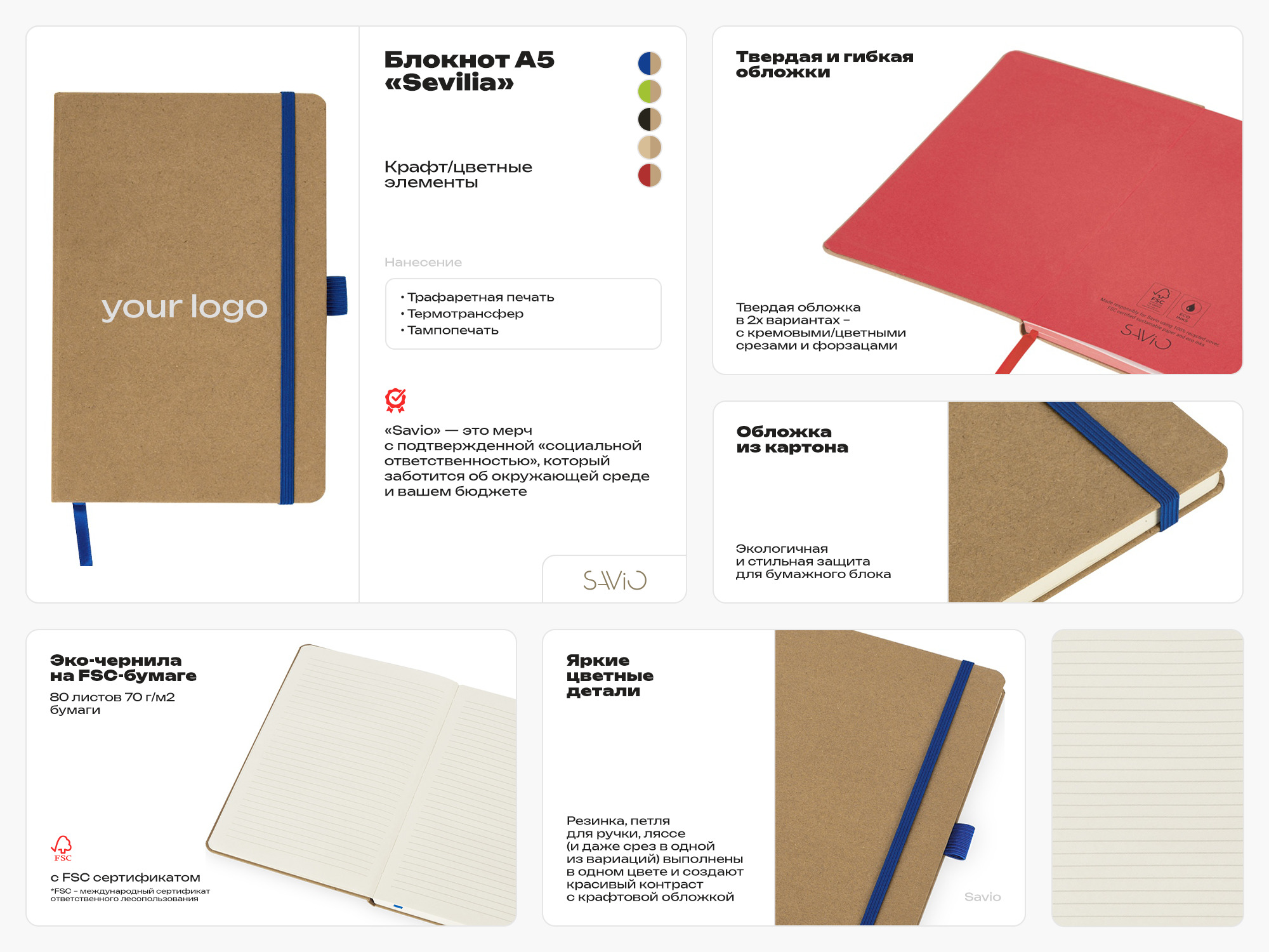 Sevilia от Savio — блокнот с твердой обложкой из крафта, закрывающийся на вертикальную резинку. Для удобства использования предусмотрены ляссе и петелька для ручки, совпадающие по цвету с резинкой.
