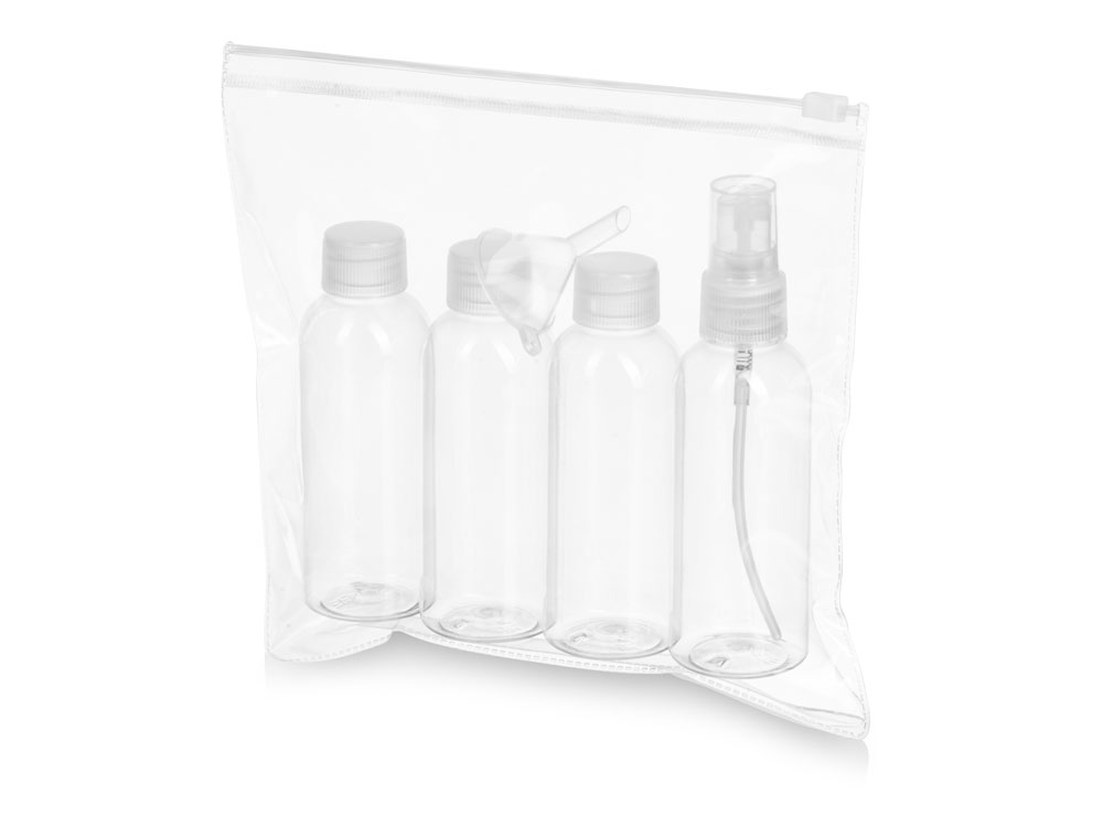 Флакончики объёмом 80 мл подойдут для шампуня, геля для душа и других косметических средств, один флакон оснащён распылителем. Бутылочки упакованы в прозрачный непромокаемый пакет на zip-lock застёжке, который дополнительно защищает багаж.
