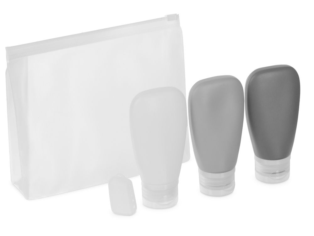 - силиконовые флакончики упакованы в полупрозрачную косметичку из EVA;