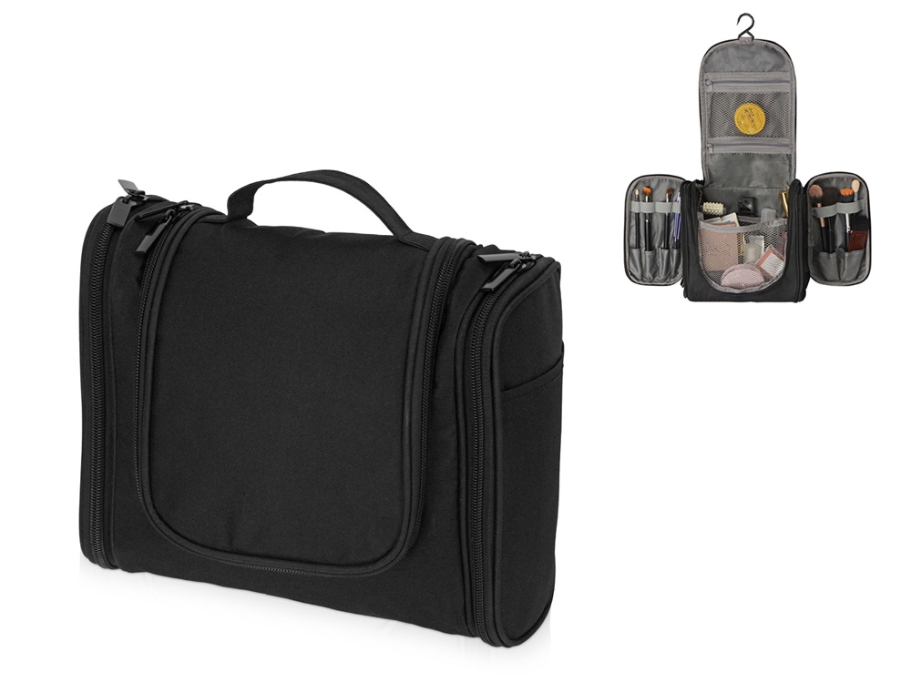 Несессер для путешествий. Эргономичный и вместительный, имеет внутренние и внешние карманы и большое отделение внутри. Оснащён ручкой для переноски и крючком для подвешивания. Нейтральный лаконичный дизайн позволяет преподнести несессер как мужчине, так и женщине;
