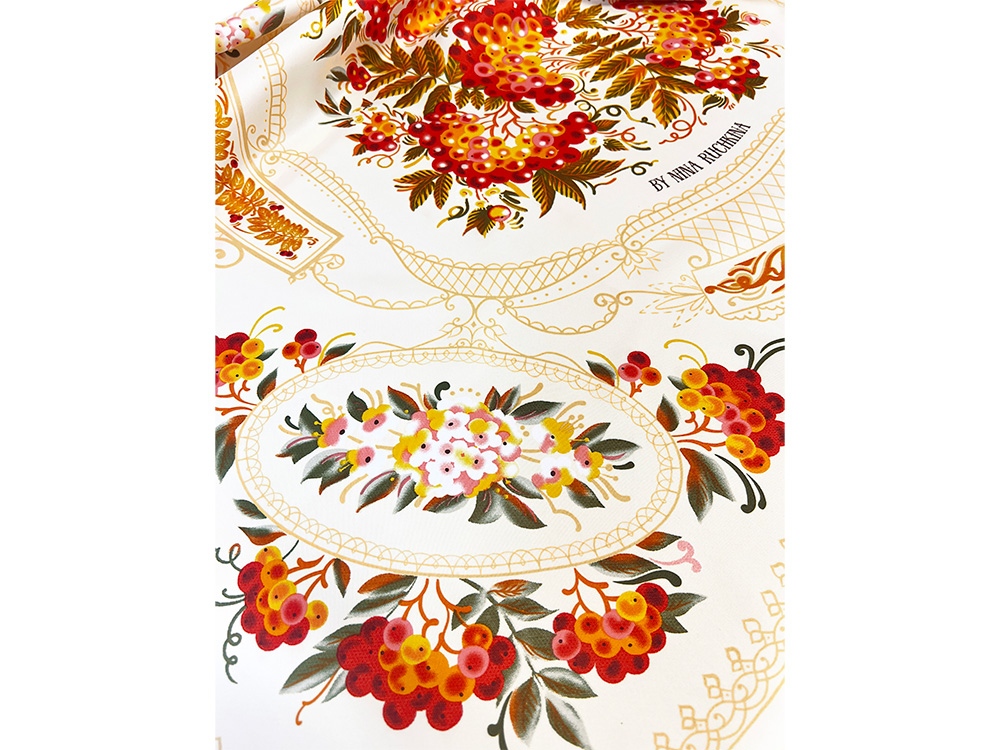 Платок «Тагильский поднос» станет ярким акцентом в вашем гардеробе. Насыщенная терракотово-чёрная цветовая гамма плодов всегда актуальна, а нежные оттенки цветов рябины внесут настроение романтичности и легкости.