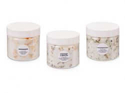 В набор входит три банки соли с ароматами календулы, можжевельника и лаванды с ванилью.