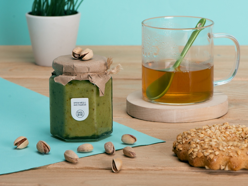Крем-мёд это настоящий десерт для сладкоежек. Благодаря своей структуре он идеально подходит как топпинг, который легко намазать и не бояться, что он растечется по тарелке. Фисташка придает крем-мёду нежнейший вкус крема-пралине.