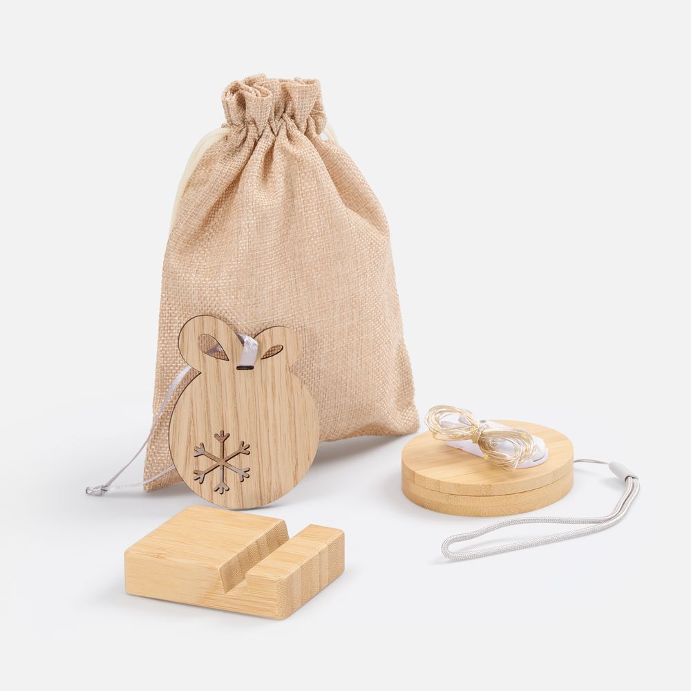 Woodward — миниатюрный подарочный набор, изящно сочетающий в себе экологичность с технологичностью. В небольшом холщовом мешочке уместились полезные аксессуары для основных гаджетов, а также, конечно, нашлось место и для приятных новогодних атрибутов. Большинство изделий изготовлено из дерева, что добавляет набору привлекательности.Woodward может смело стать как частью большого набора, так и самостоятельным подарком — стильным и функциональным.Woodward. Экологичные отношения во всем.