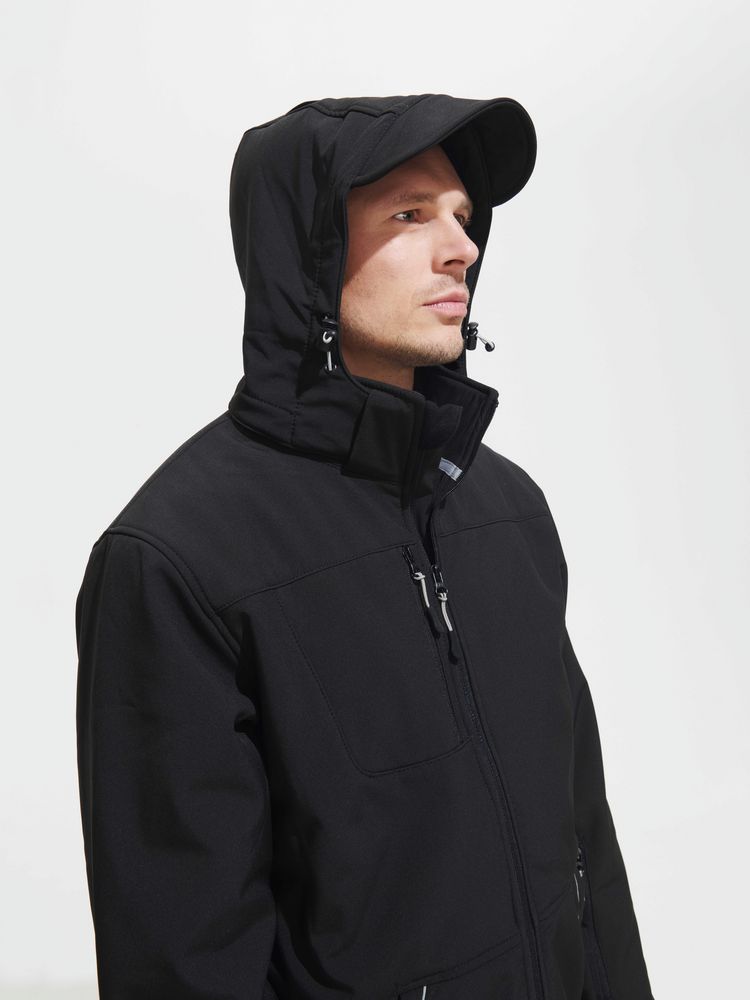 Куртка из материала Softshell. Водостойкость: 8000 мм, паропроницаемость: 1000 г/м² · 24 часа. Полностью стеганый софтшеллСнимающийся капюшон, регулируемый стягивающим шнуром, а также «липучкой» на спинеЗакругленная задняя часть жакетаДве молнии для облегчения доступа к зонам нанесенияСтягивающие шнурки внизу изделияКонтрастные вставки серого цвета, светоотражающие детали3 кармана на молнии спереди, 1 карман на молнии на рукаве, 1 внутренний карман на молнии, 1 внутренний карман в сеткуОтверстие для шнура/провода во внутреннем карманеМанжеты, регулируемые «липучкой», усиленные тканью стретч