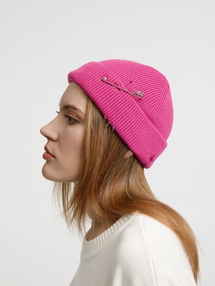 Однослойная шапка бини с рваным отворотом и металлическими аксессуарами для дерзких образов в любом возрасте. Яркий и запоминающийся акцент в стиле гранж.Поставляется в пакете с липким краем.