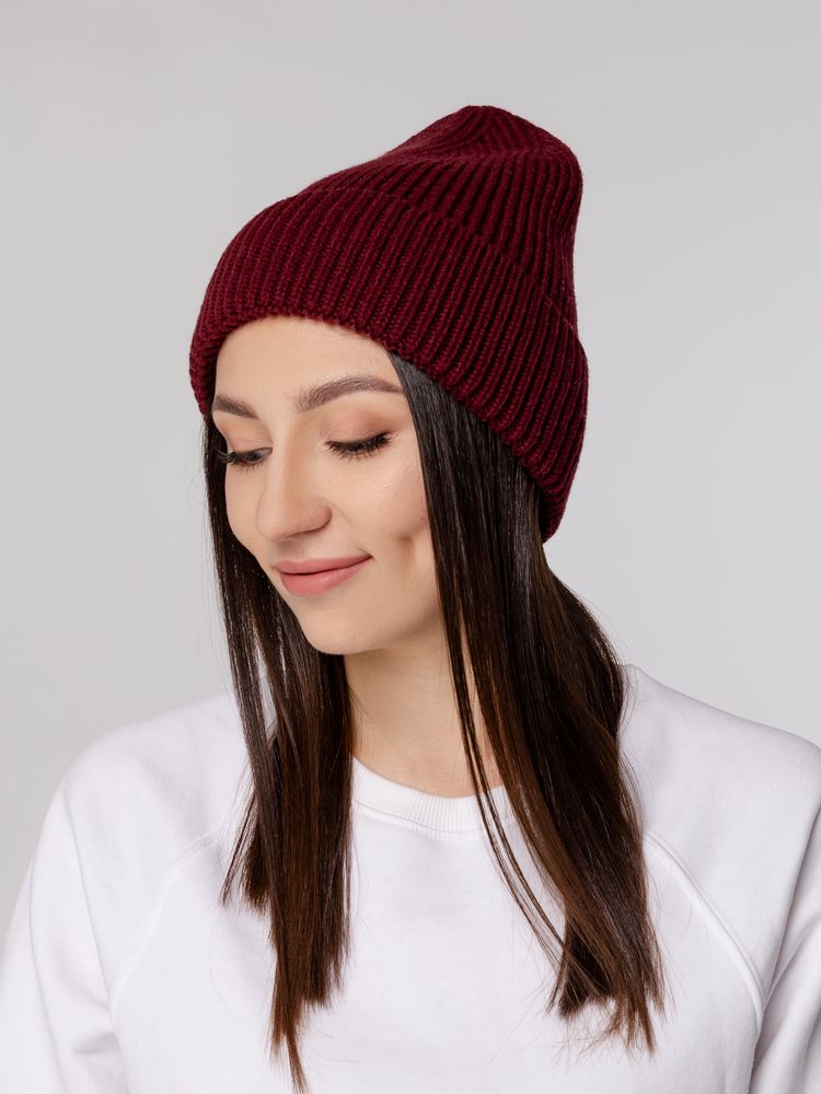Шапка-бини из полушерстяной пряжи актуальных приглушенных оттенков. Трендовый фасон с удлиненным верхом — для расслабленного повседневного образа.Однослойная шапка рельефной вязки с отворотом.Модель унисекс.Поставляется в пакете с липким краем.