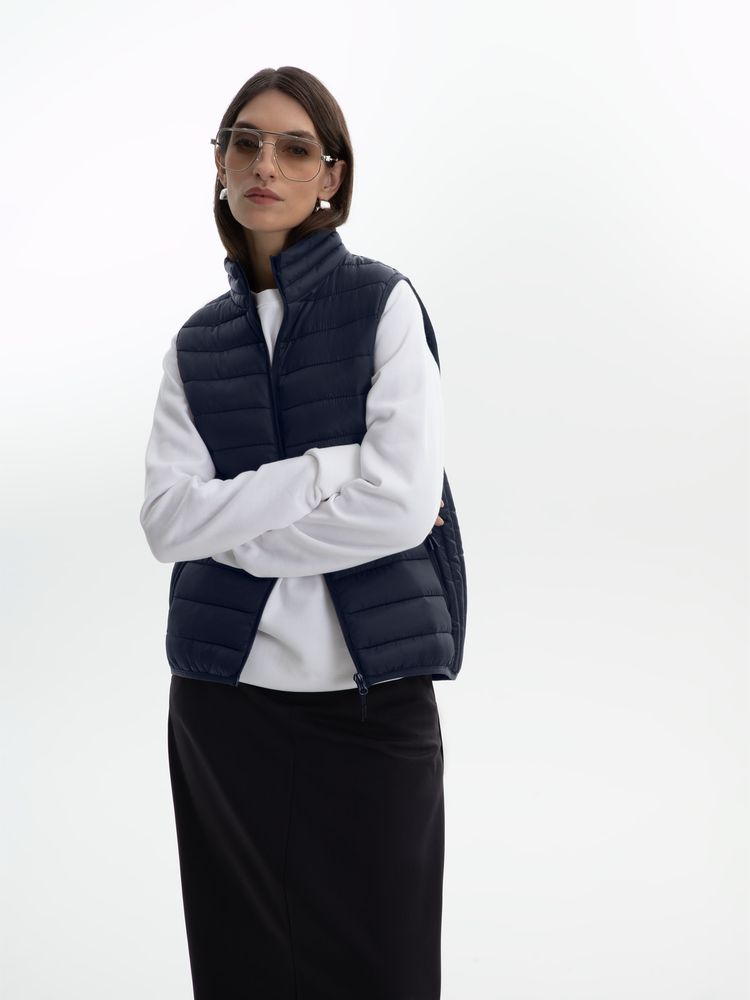 Женский жилет на молнии.Воротник-стойкаДва боковых кармана на молнииПройма и низ изделия обработаны эластичной бейкой в цвет изделияМешочек для хранения в комплекте