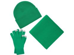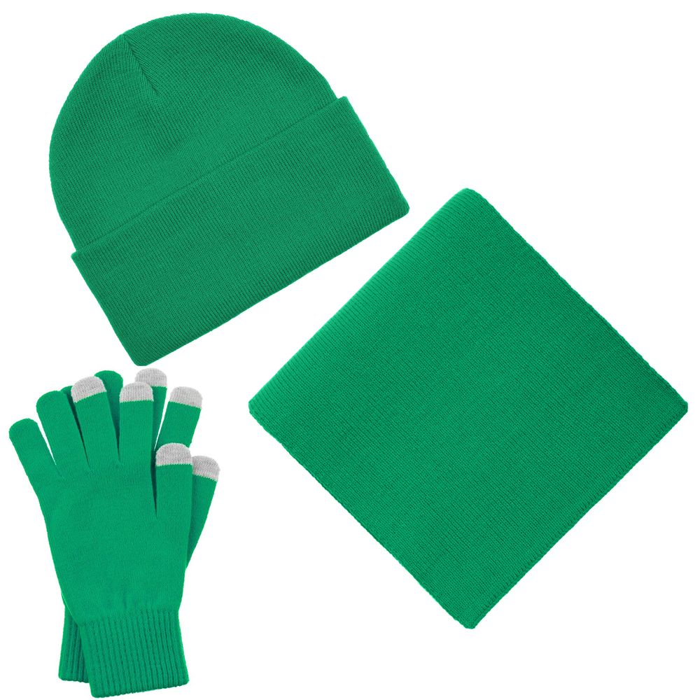 В комплект входят двухслойная шапка с регулируемым отворотом и легкий однослойный шарф из мягкой акриловой пряжи, сохраняющие тепло и защищающие от ветра, а также эргономичные перчатки со специальными токопроводящими волокнами на кончиках пальцев, позволяющие свободно пользоваться смартфоном даже в холодную погоду. Универсальная цветовая гамма и лаконичный дизайн делают набор органичным дополнением к любой верхней одежде. Набор поставляется в коробке с возможностью полной запечатки — идеальное решение для корпоративных подарков и промоакций.