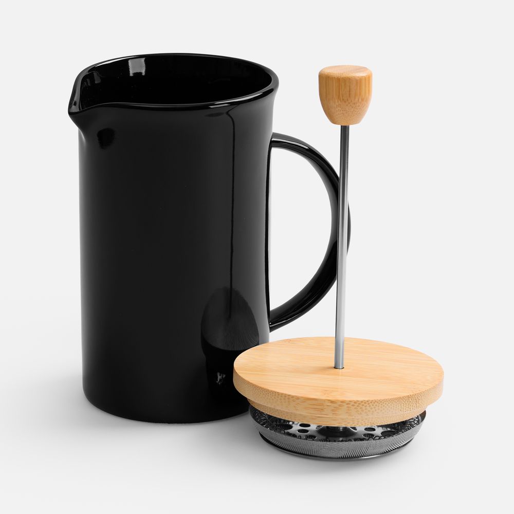 Элегантный керамический френч-пресс Mezzo в глянцевом черном исполнении — функциональный кухонный аксессуар и украшение любого пространства, от уютной домашней кухни до стильного офиса.Емкость 600 мл.Элементы из бамбука не подходят для мытья в посудомоечной машине.