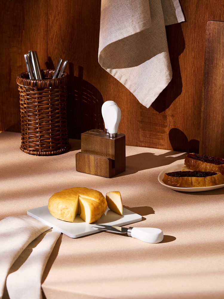 Marmara — компактный сырный набор с мраморной доской и ножами на деревянной подставке. Стильный и удобный, он превращает обычный перекус в маленький гастрономический праздник.В наборе:разделочная доска для нарезания и подачи;вилка для сыра;нож-лопатка для мягкого сыра;листовидный нож для сыра твердых сортов;удобная подставка для хранения.Рекомендуется мыть ножи вручную, чтобы продлить срок их службы и сохранить остроту лезвий. Толщина лезвий ножа 1,5 мм.Поставляется в индивидуальной транспортной коробке.