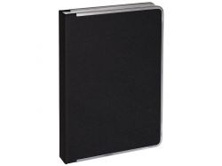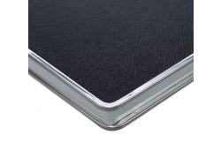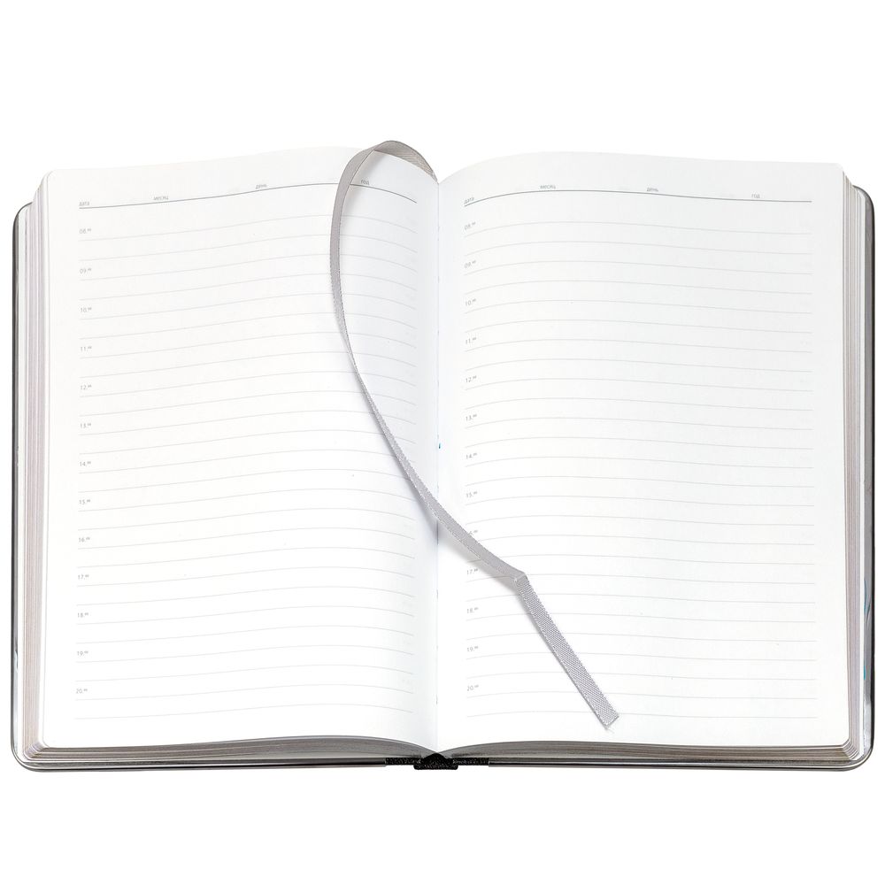 Ежедневник с твердой обложкой и серебристым обрезом, выполнен из материала Saffian, черный, дополнен серым ляссе и металлическими рамками.Блок 985, без календарной сетки и информационного блока:Кол-во страниц — 256;Бумага — белая, плотность 70 г/м²;Форзац и нахзац — белые.