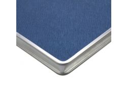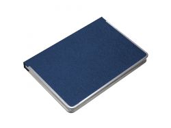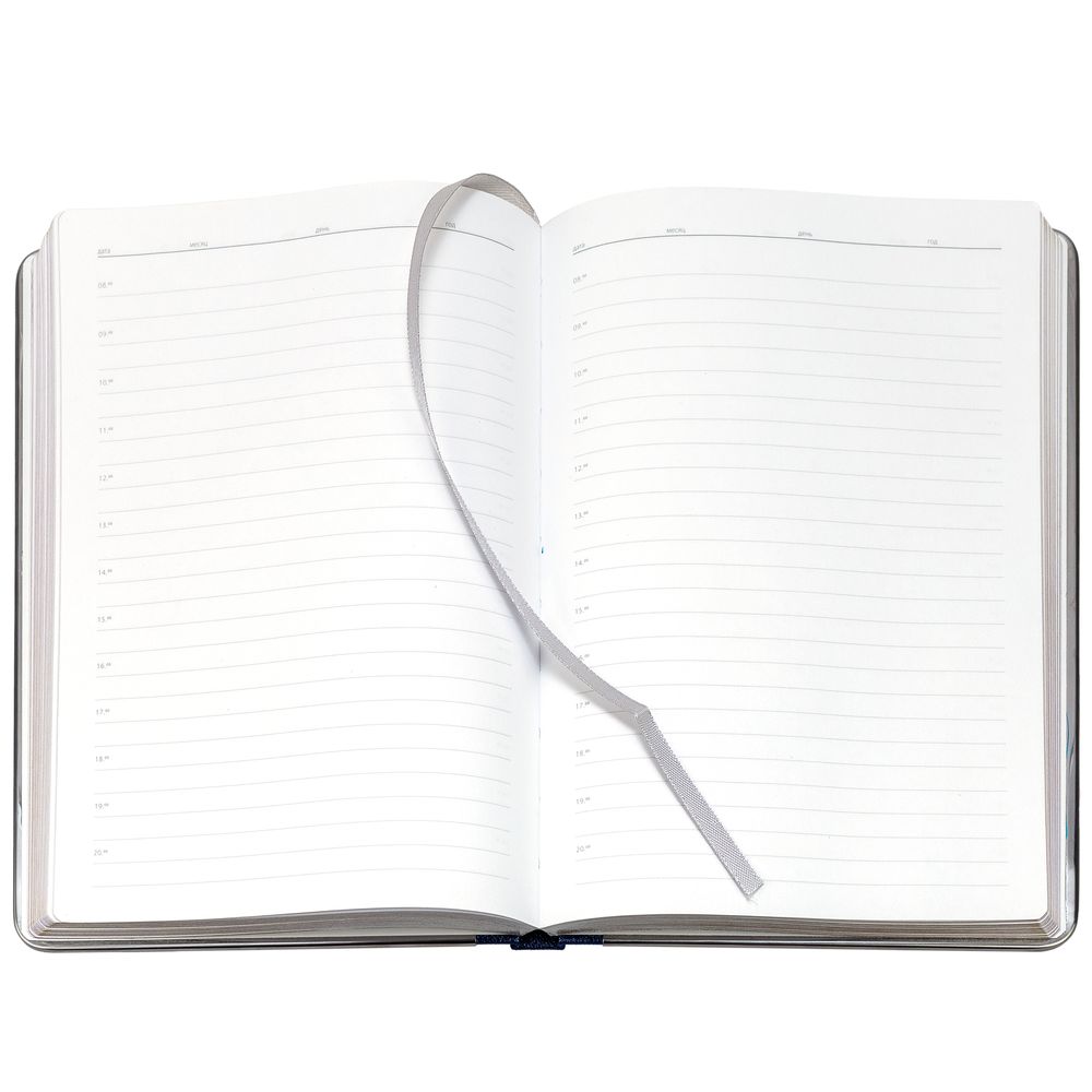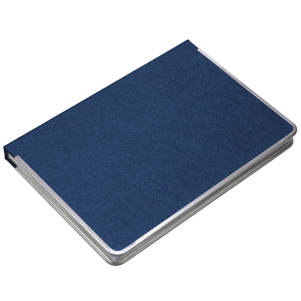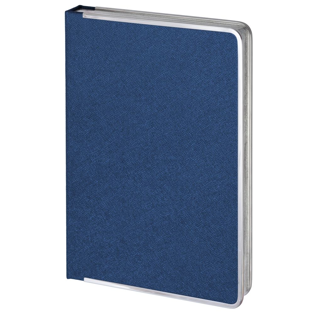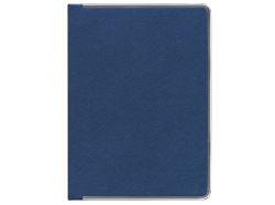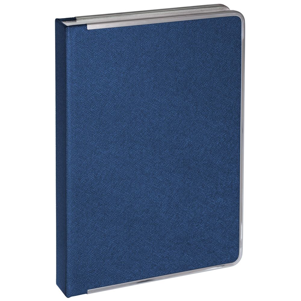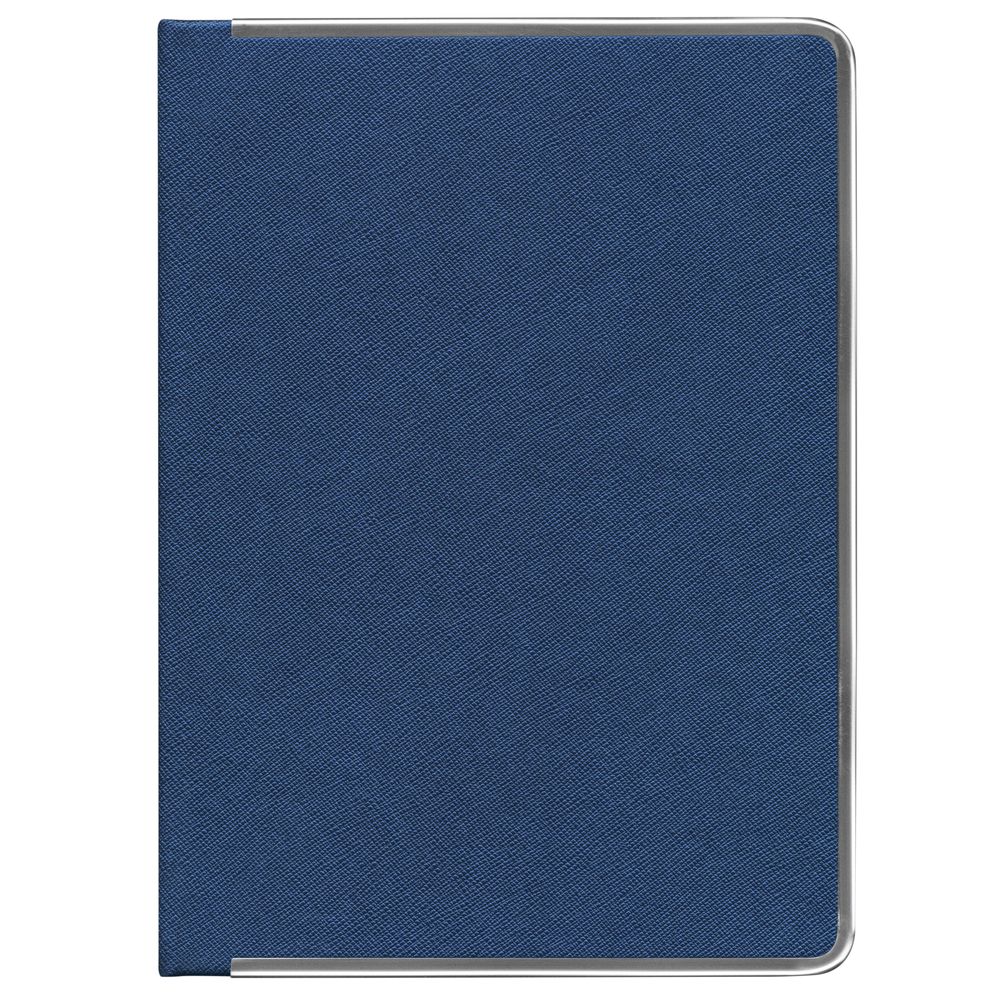 Ежедневник с твердой обложкой и серебристым обрезом, выполнен из материала Saffian, синий, дополнен серым ляссе и металлическими рамками.Блок 985, без календарной сетки и информационного блока:Кол-во страниц — 256;Бумага — белая, плотность 70 г/м²;Форзац и нахзац — белые.