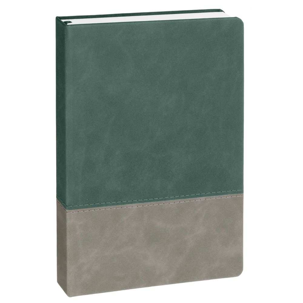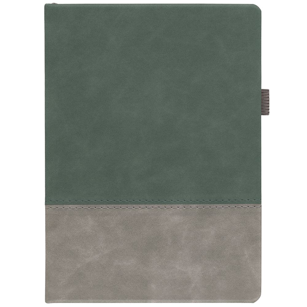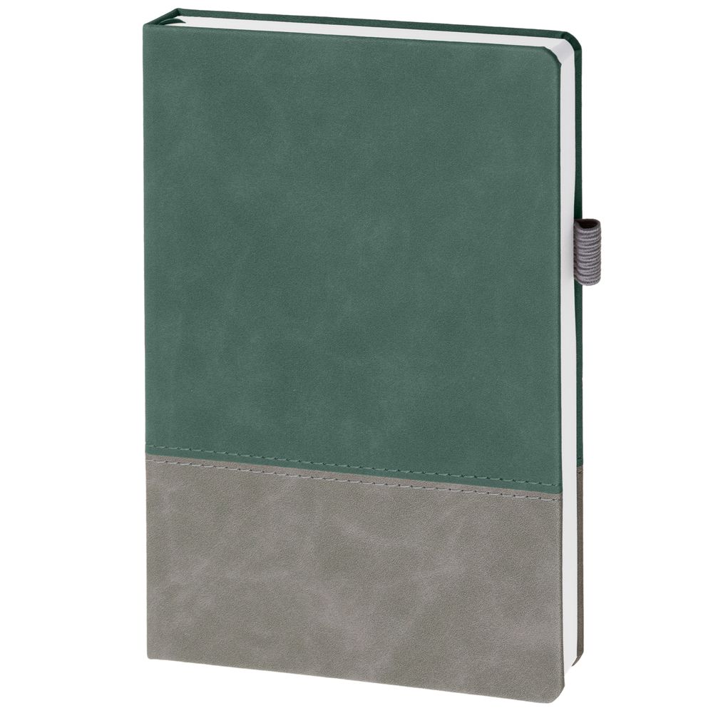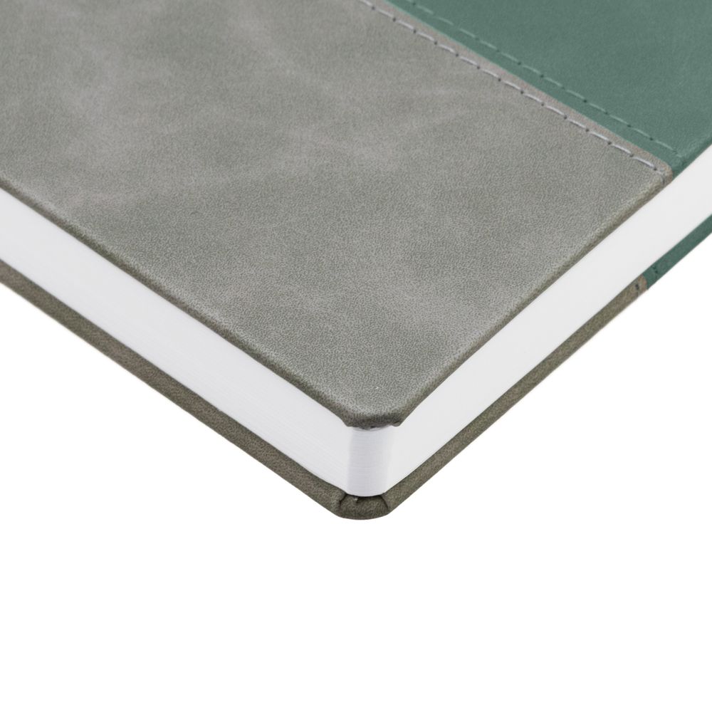 Ежедневник с твердой обложкой, без поролона, со сшивкой материалов Nubuck Touch, серый СС, и Nubuck Touch зеленый FF, дополнен двойным ляссе и петлей-резинкой для ручки.Блок 985, без календарной сетки и информационного блока:Кол-во страниц — 256;Бумага — белая, плотность 70 г/м²;Форзац и нахзац — белые.