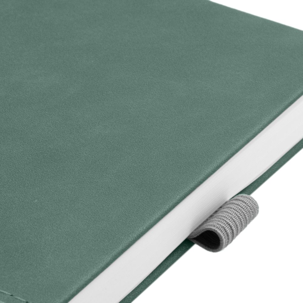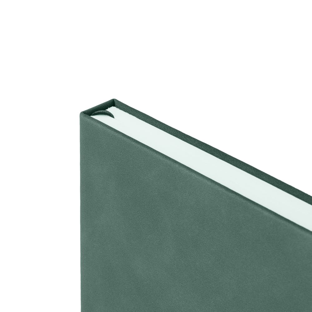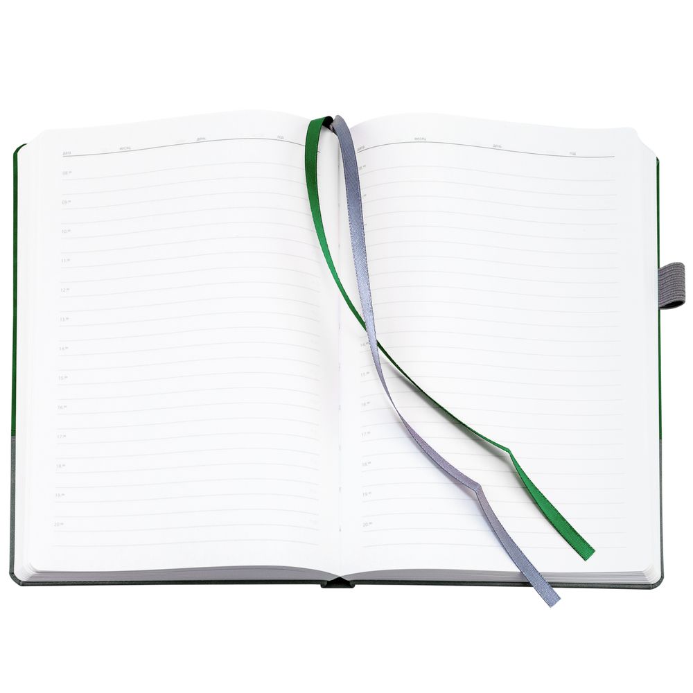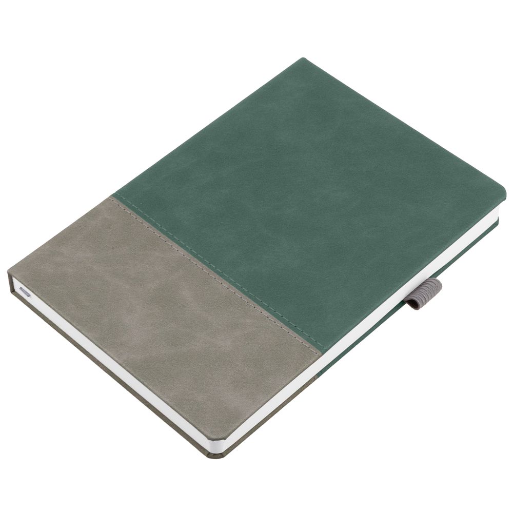Ежедневник с твердой обложкой, без поролона, со сшивкой материалов Nubuck Touch, серый СС, и Nubuck Touch зеленый FF, дополнен двойным ляссе и петлей-резинкой для ручки.Блок 985, без календарной сетки и информационного блока:Кол-во страниц — 256;Бумага — белая, плотность 70 г/м²;Форзац и нахзац — белые.
